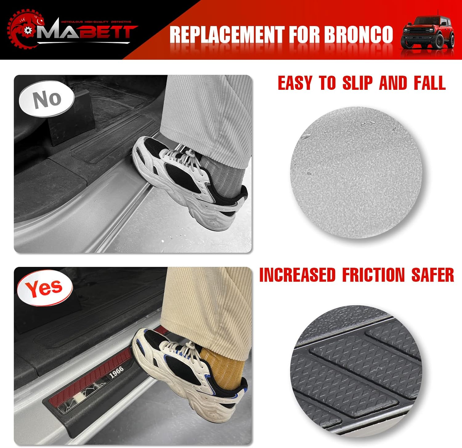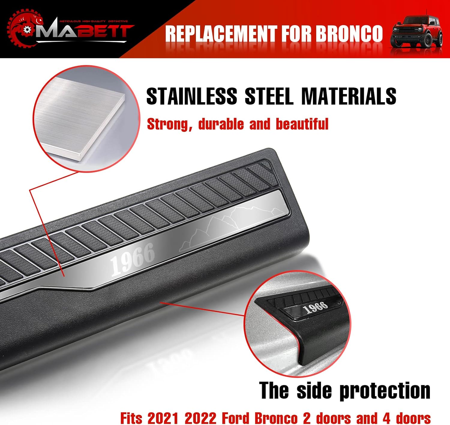 Keywords: Ford Bronco door sill guards 2021 2022 2023 2024, Bronco 4-door threshold protectors, Retro 1966 Bronco accessories, ABS stainless steel door entry guards, anti-slip car sill covers for Ford Bronco.