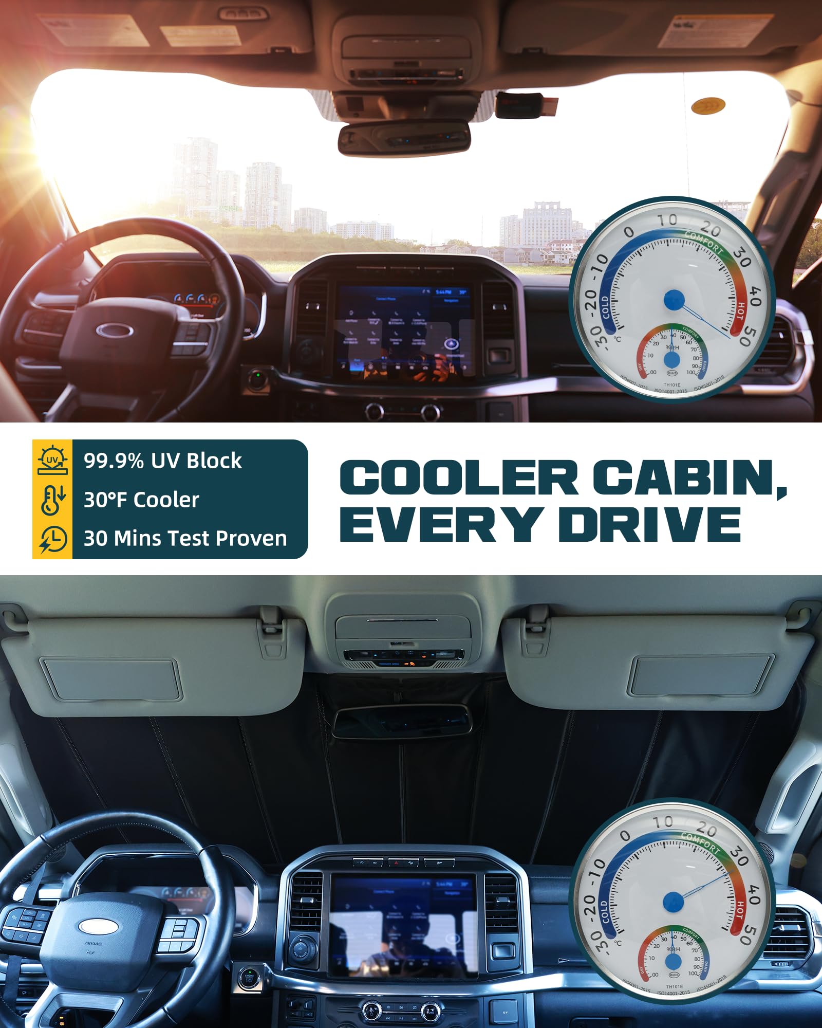 - Custom Fit for 2021–2026 Ford F-150: Precision-cut to hug every curve of the windshield for full blackout coverage. Blocks glare while protecting your dashboard, leather, and electronics from cracks, fading, or peeling.